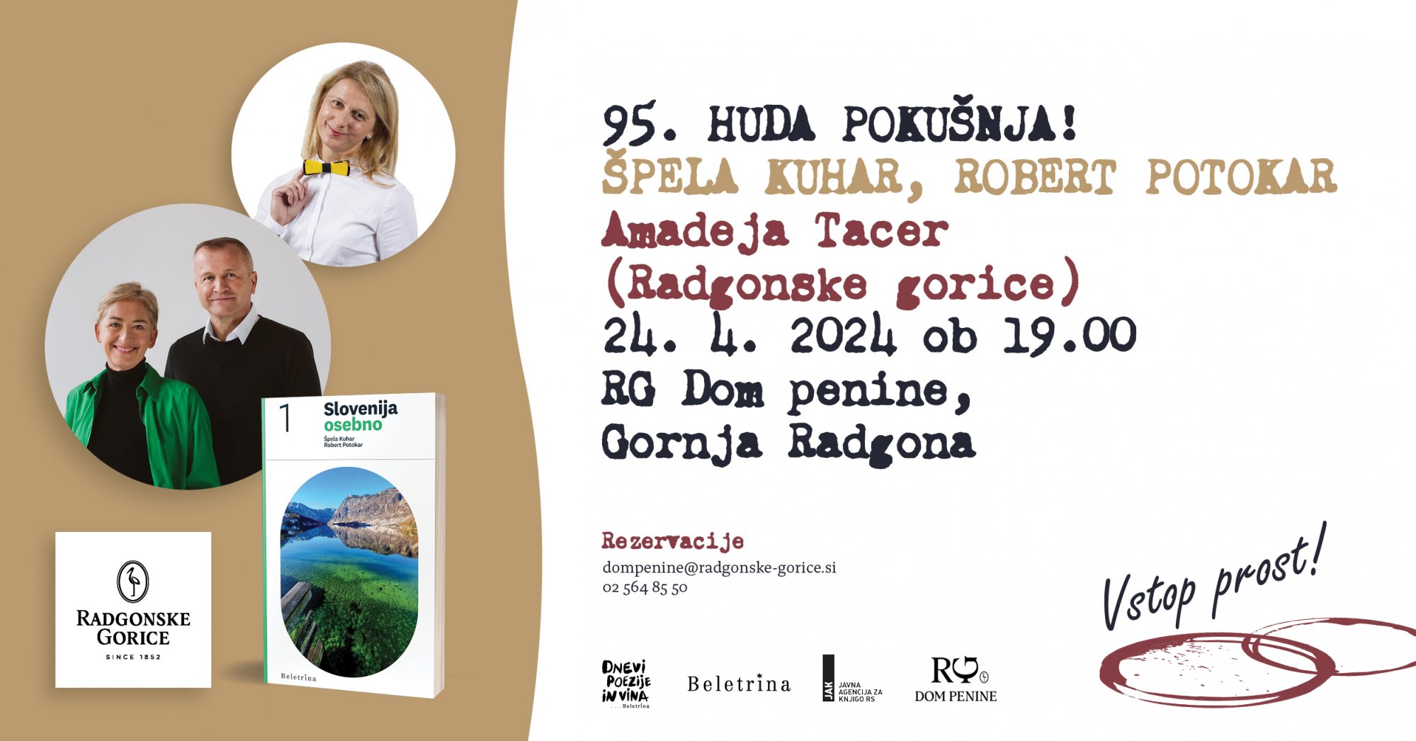 Literarno-vinski dogodek bosta 𝘃 𝘀𝗿𝗲𝗱𝗼, 𝟮𝟰. 𝗮𝗽𝗿𝗶𝗹𝗮, 𝗼𝗯 𝟭𝟵. 𝘂𝗿𝗶 vodila 𝗝𝗼𝘇̌𝗲 𝗥𝗼𝘇𝗺𝗮𝗻 in 𝗞𝗿𝗶𝘀𝘁𝗶𝗻𝗮 𝗞𝗼𝗰̌𝗮𝗻.